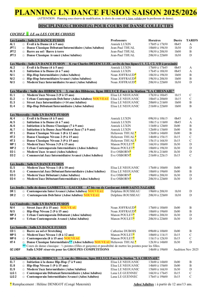 Planning LN DANCE FUSION (Saison 2025/2026)